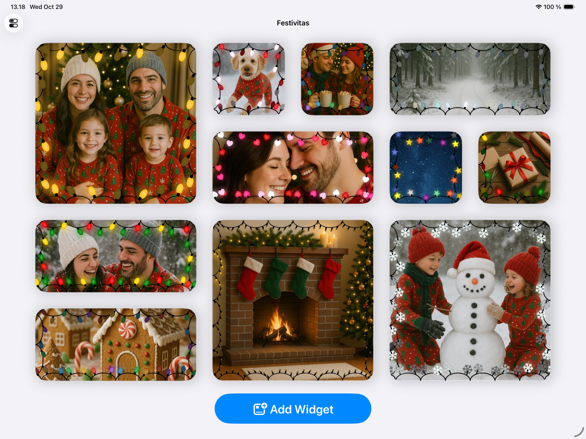 على أجهزة iPhone وiPad، يتميز التطبيق بعناصر واجهة مستخدم متحركة تجسد روح العطلة. يمكنك استخدام صورك المفضلة في عناصر واجهة المستخدم في أضواء الأعياد.