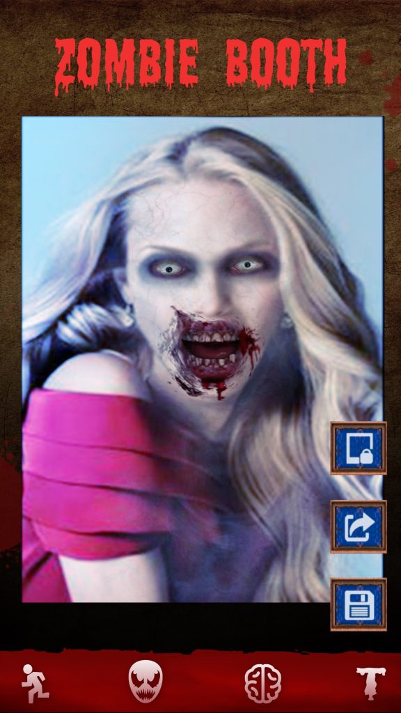 تطبيق كشك صور سهل الاستخدام يقدم بعض الإضافات. يمكنك إضافة بقع وبقع الدم أو تضمين أجزاء مقطعة أو أعضاء دموية إلى صورتك الزومبية.